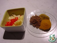 Имбирь и чеснок чистим и нарезаем как можно помельче. Из красного перца удаляем семена и его тоже измельчаем. Отмериваем и сухие специи – во время жарки времени не будет.