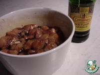 Куриную грудку режем на мелкие кусочки и маринуем в соевом соусе. Полчасика будет достаточно.