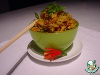 Последним добавляем рис (обязаельно холодным) все хорошо перемешиваем и жарим, пока рис не прогреется. Если все правильно сделано, то рис будет рассыпчатым и красивого желтого цвета. Приятного аппетита!
