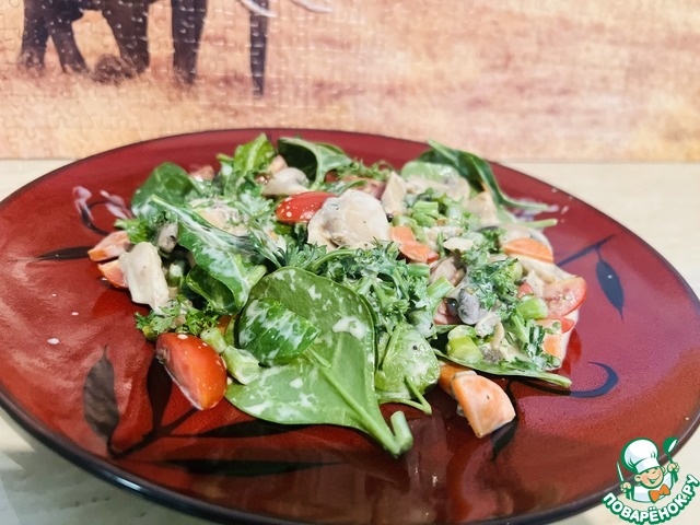 Очень сочный и полезный салат с «королeм овощей», чем является шпинат!!! Родиной шпината, по-видимому, является или Кавказ, или Ближний Восток. В средние века шпинат завезли в Западную Европу рыцари-крестоносцы. Долгое время шпинат был кушаньем только для знатного стола. О нем упоминается в поваренных книгах Х1 V века короля Англии Ричарда II. Постепенно это растение распространилось по всей Европе. В России оно появилось в середине ХVIII века. «Король овощей» славился как королевское кушанье. Так, источники свидетельствуют, что на обеде у императрицы Анны Ивановны в честь приезда принца курляндского было «потреблено шпината два мешка». Благодаря содержанию большого количества белка, а также разнообразных витаминов (особенно А и С), шпинат является ценным продуктом для детского и диетического питания, используется при лечении малокровия, сахарного диабета и для профилактики пародонтоза.