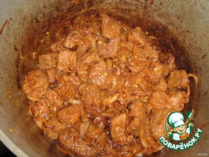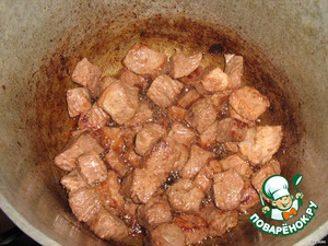 В кипящее масло положить мясо. Всё жарим на сильном огне