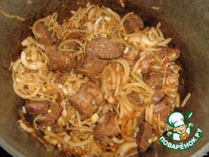 В обжаренное мясо добавляем лук. Огонь не уменьшать