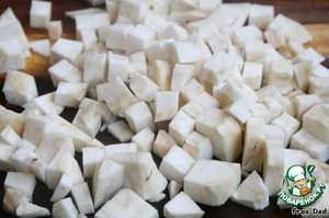 Корень сельдерея нарезать кубиками.