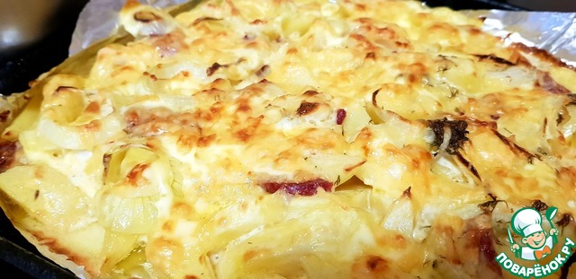 Всe хорошо перемешать, равномерно распределить по противню. Сверху равномерно разложить лук, нарезанный полукольцами, затем залить всe сливками (можно добавить водички и немного сливочного масла), сверху равномерно засыпать сыром.