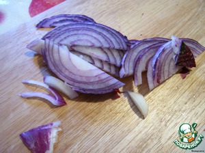 У меня был красный лук, с ним наряднее и вкус у него, как мне кажется, помягче. Режем его также тонкими полукольцами.