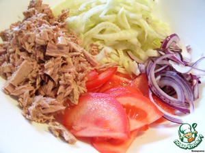 С тунца сливаем жидкость и разминаем кусочки вилкой. Складываем наши ингредиенты в салатник.