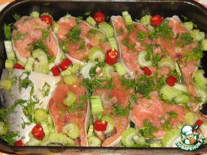 Горбушу почистить, нарезать на порционные кусочки. Стебли сельдерея и перчик чили нарезать дольками, укроп нашинковать. Кусочки рыбы уложить в жаростойкую посуду, я использовала противень с бортиками. Рыбу посыпать укропом, рядом поместить сельдерей, перец чили, посолить и полить соком лимона. Оставить мариноваться на несколько минут. Далее к рыбе подлить воды и запечь в духовке. У меня процесс занял около 30 минут. Приправы отдали свои "соки" в воду и напитали получившимся бульоном рыбку. Получилось очень нежно и пикантно.