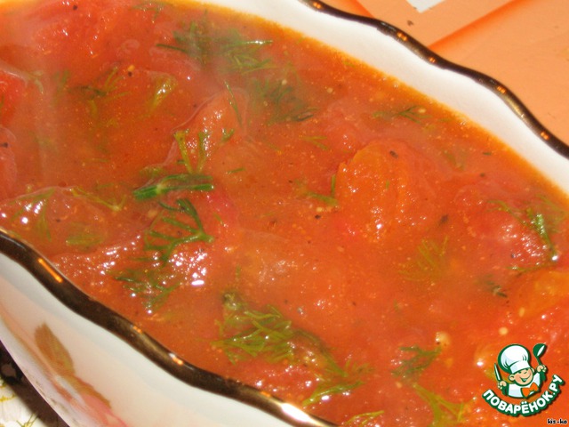 Когда помидоры превратяться в соус, добавить к ним измельченный укроп, посолить, поперчить. Потушить еще несколько минут и снять с огня.
