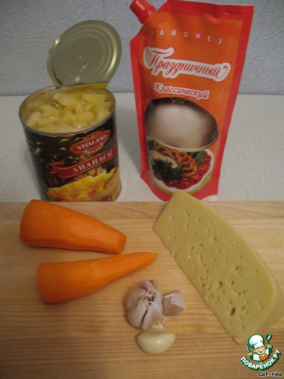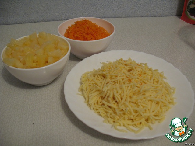 • Морковку и сыр натереть, ананасы при необходимости порезать, у меня были ломтиками как раз нужного размера :)