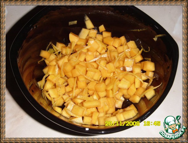 1 чашку (240 мл) тыквы нарезать кубиками и цедру 1 апельсина залить 50 мл апельсинового ликера (брала другой) и оставить на 30 мин.