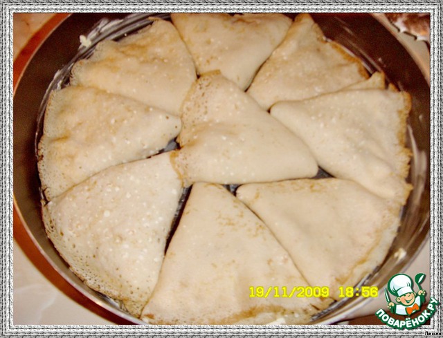 Подготовить форму, смазав сливочным маслом. Разложить блинчики.