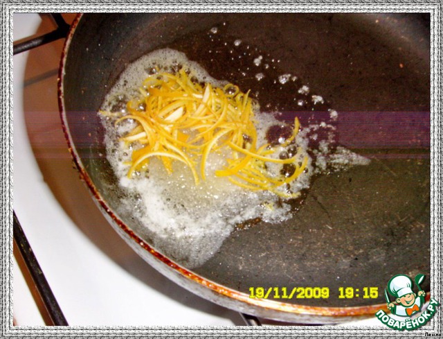 Пока готовятся блинчики, снять с половинки апельсина цедру как можно тоньше (без белого), нарезать ее тоненькой соломкой. И выжать сок из апельсина. -