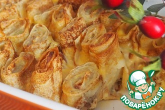 Завернуть начинку в блинчики, сложить их в форму и приготовить.