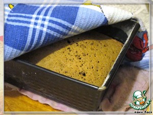 Испеклось - вытащили, поставили на досочку, на мокрую тряпочку (по крайней мере я так делаю), прикрыли полотенчиком. Минут через 5-10 можно вытаскивать (я переворачиваю на доску, а потом обратно - на блюдо). Верх потрескался при этом, раскрошился, корочка получилась очень хрупкая.