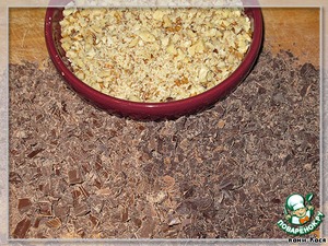 Орехи и шоколад порубить ножом (можно натереть шоколад, но мне легче рубить). Орехи не молоть! Должны быть небольшие кусочки.