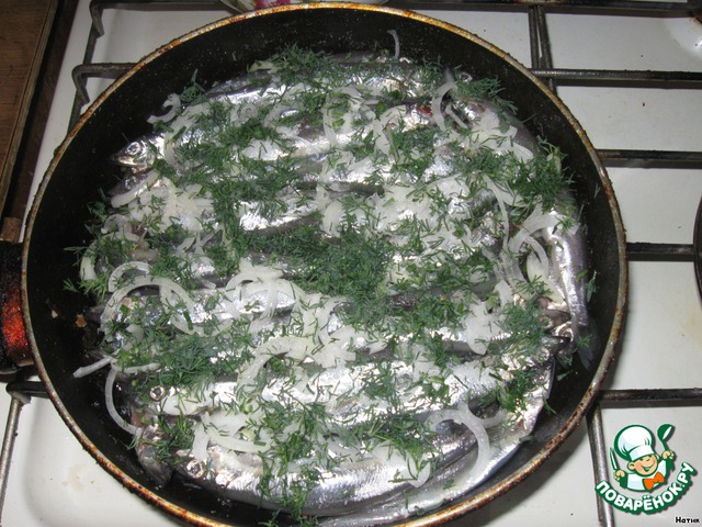 • Лук нарезать: репчатый - полукольцами, зеленый - мелко (используется один вид лука), мелко нарезать зелень. Мойву вымыть, не очищать. Выкладываем в сковороду мойву слоями, пересыпаем каждый слой луком и зеленью.