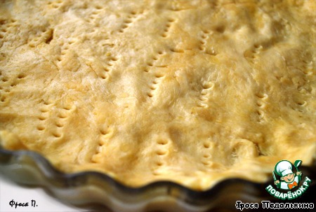 • Тесто раскатать, выложить в смазанную жиром форму (24-26 см, сформировать бортики и часто наколоть вилкой, снова убрать в холодильник.