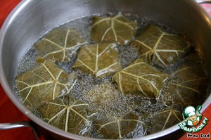 А здесь идет особенность нашей долмы - залить до краев последнего ряда, но не простым кипятком, а мясным бульоном - так долма получается с более насыщенным мясным вкусом. Если заливать водой - вкус совсем другой, проверено!