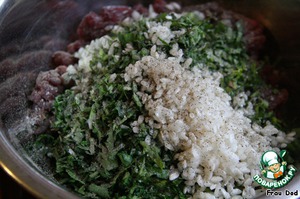 Соединить фарш, рис, зелень, соль, перец. Перемешать.