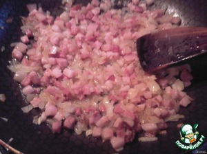 Луковицу мелко нарезать, обжарить, добавить мелко нарезанный бекон (грудинку), хорошенько обжарить.
