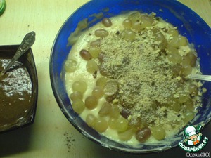 Высыпаем в основное тесто виноград и грецкие орехи