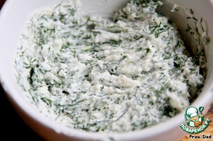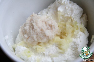 Добавить в творог выдавленный через пресс чеснок и хрен, посолить.