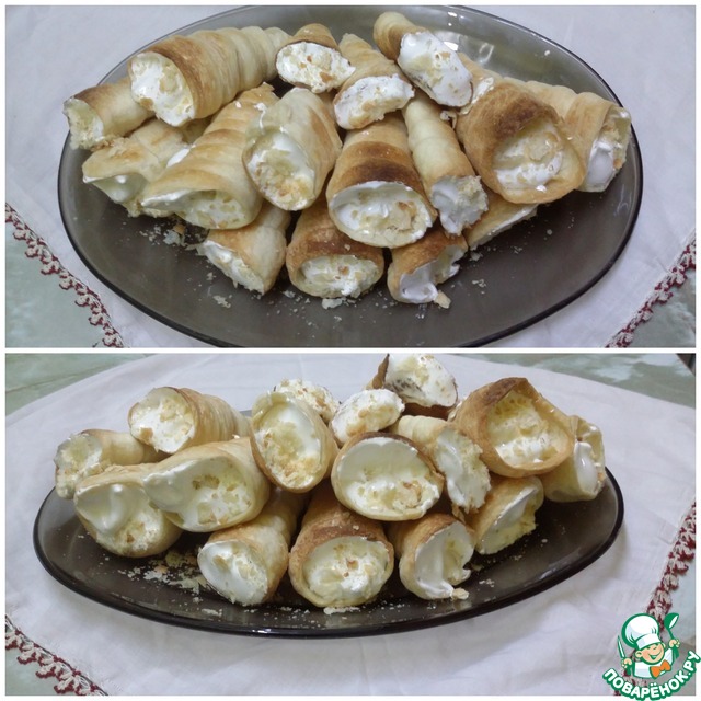 Теперь начиняем трубочки кремом (я использовала шприц), а сверху посыпаем крошками. Для этого придется пожертвовать одну трубочку, вернее, ее половину.