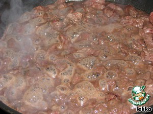 Когда все кусочки мяса обжарились (этим действием мы сохраним вкус и сочность), заливаем мясо кипятком (обязательно, тогда мясо не станет жестким), закрываем крышкой и убавляем огонь до минимума.