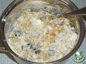 • Теперь смешиваем муку, овсянные хлопья, яблочко, изюм и сахар.