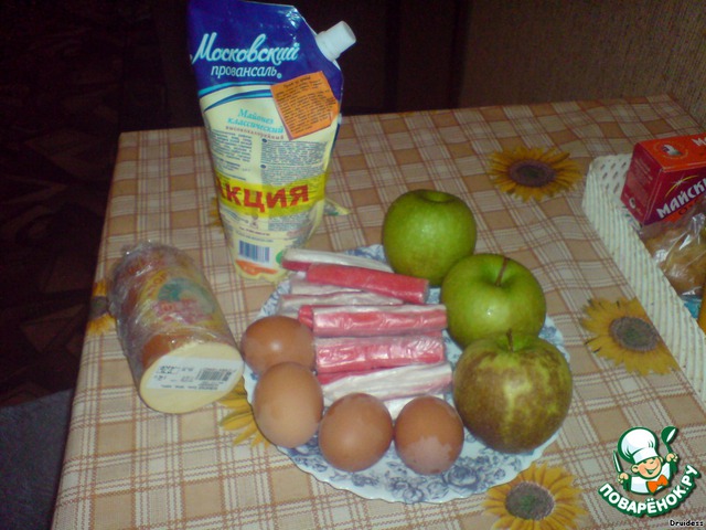 Яйца отварить, яблоки тщательно вымыть, крабовые палочки освободить от оболочки.