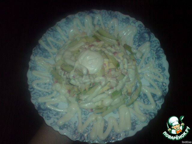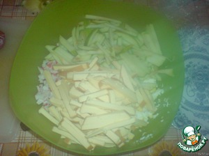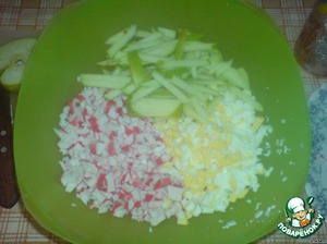 Из яблок (я беру симиренка, но можно антоновку или любые другие кисло-сладкие яблоки) удалить сердцевину, порезать соломкой, добавить к яйцам и крабовым палочкам. В оригинале кожица не была срезана, поэтому я не срезаю. Но хуже от этого, я думаю, не будет.