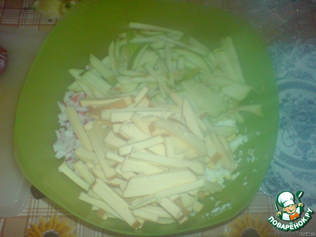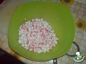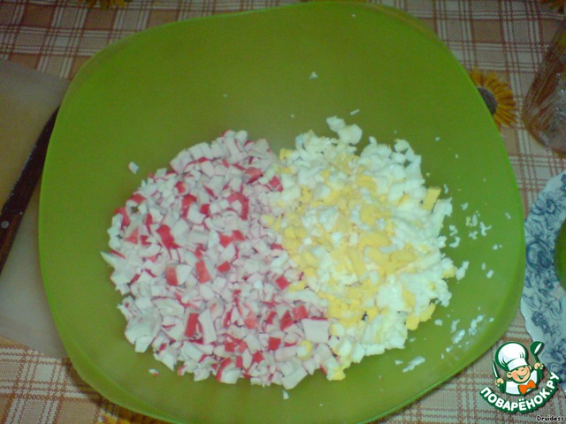 Яйца - тоже кубиками. Я использую и для яиц, и для крабовых палочек яйцерезку - очень удобно, меньше возни.