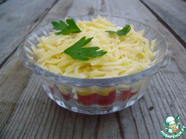 3 слой - посыпать измельчённым чесноком и сделать сеточку из майонеза -