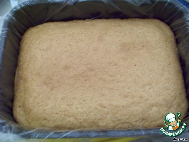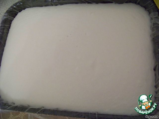Выпеченный коржик охлаждаем, если разъемная форма, то оставляем прямо в ней, я пекла в обычной прямоугольной форме, вытряхнула из нее коржик, положила пищевую пленку, а сверху остывший корж. Можно, наверно, и без этого, но не знаю, насколько сложно будет в этом случае вытаскивать готовое пирожное, поэтому решила перестраховаться. Края пленки лучше оставить побольше.