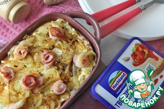 Рис перемешать с яйцами (2 шт.). Выложить в жаропрочную форму,смазанную маслом и посыпанную сухарями.