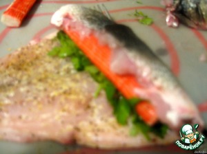 В рыбу положить крабовую палочку и нарезанную кинзу, аккуратно скатать в рулетик до хвоста .