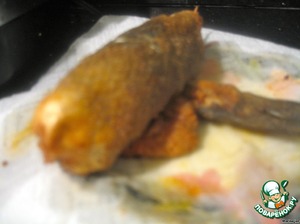 Осторожно помещаем рулетик с хвостом во фритюр, снимаем на салфетку. То же проделываем с колечками из рыбы.