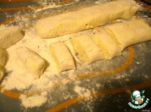 Готовим вареники: творог, сыр, яйцо перемешать, замесить нежное тесто (оно пристает к рукам), обвалять в муке, сделать колбаски, нарезать