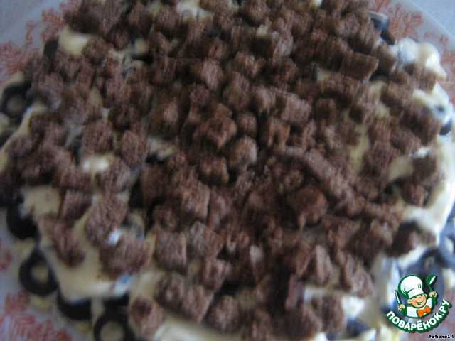 Бородинский хлеб 3-4 ломтика порезать на сухарики и подсушить в микроволновке (духовке или сухой сковороде). Дать остыть и выложить следующим слоем. Этот слой смазывать майонезом не нужно.