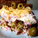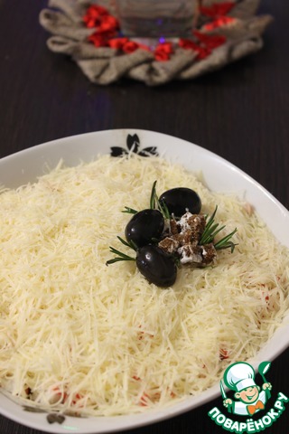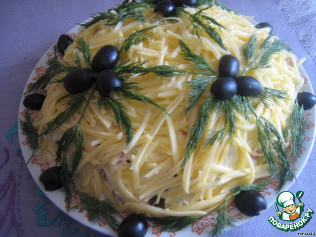 Натереть сыр, выложить последним слоем. Укасить по желанию, дать настояться 1-2 часа и подавать к столу. Приятного аппетита! Попробуйте, может вам он тоже понравится.