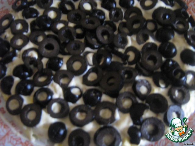 Маслины порезать, выложить на слой яиц, смазав майонезом.