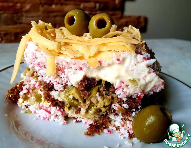 Очень понравилось неизбитое сочетание крабовых палочек и маслин, а черный хлеб внес свою особую нотку. Съели с огромным удовольствием.