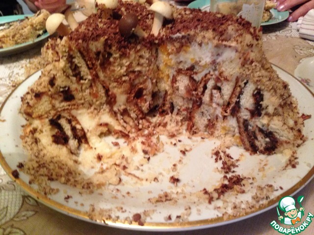 В интернете он встречается под названием "Трухлявый пень" и торт-сметанник "Пикантный". Я его слегка подправил и назвал новым именем. Впрочем, суть не в названии. Довольно интересное решение.