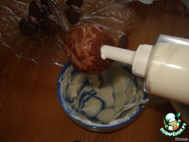 С помощью кондитерского шприца делаем нашим эклерчикам творожные инъекции. С такой начинкой их желательно хранить в холодильнике и не больше суток, так как могут размокнуть.