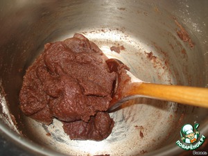 Как только вода закипит, а масло растает, всыпать муку с какао и быстренько мешать лопаткой, пока не получится ком теста. Выключить огонь и кастрюльку с тестом поставить немного остыть.