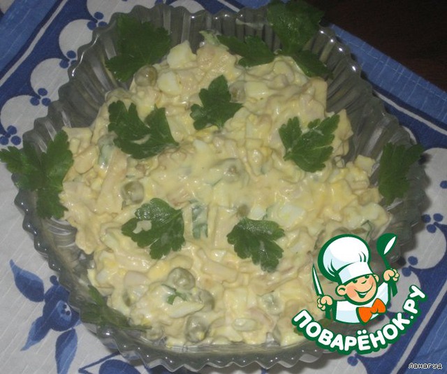 Смешать кальмары, яблоко, яйца, зеленый горошек, зелень,