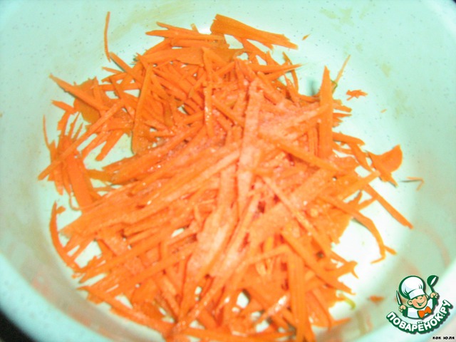 Морковь натираем на корейской тёрке, или режем мелкой соломкой. Солим.