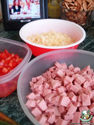 Сначала нарезаем колбасу, помидоры и натираем на терке сыр.