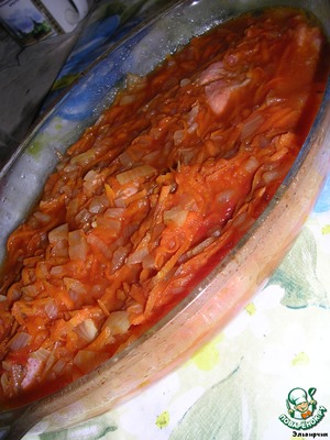 Лук и морковь обжарить, добавить воды или бульон + томатную пасту - потушить. Дать остыть. Залить рыбку.