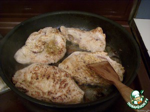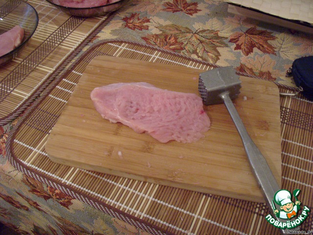 Грудку индейки порезать на куски толщиной 1-1.5 см (либо готовые эскалопы). Каждый кусочек аккуратно отбить, посолить, поперчить.